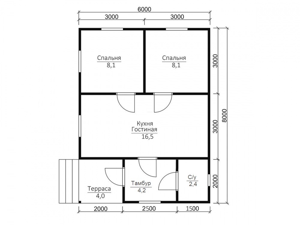Общая площадь дома с составляет 43.9 кв.м., размеры дома – 6х8 м..