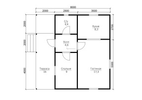 Общая площадь дома с большой террасой составляет 44 кв.м., размеры дома – 8х8 м..